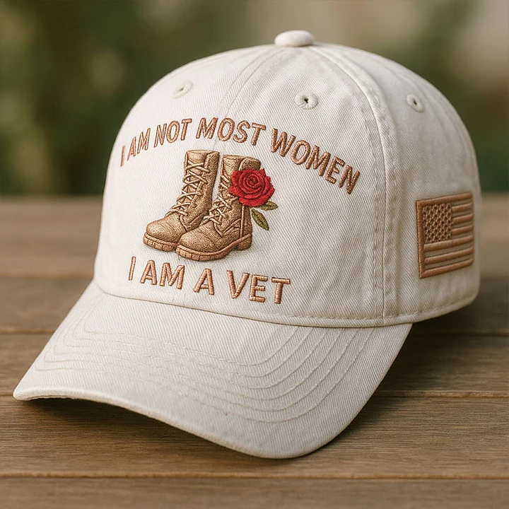 Empowering Design: Boasts bold embroidery “I AM NOT MOST WOMEN, I AM A VET”, paired with military boots and a red rose – a fearless proclamation of women veterans’ distinct identity and resilience.